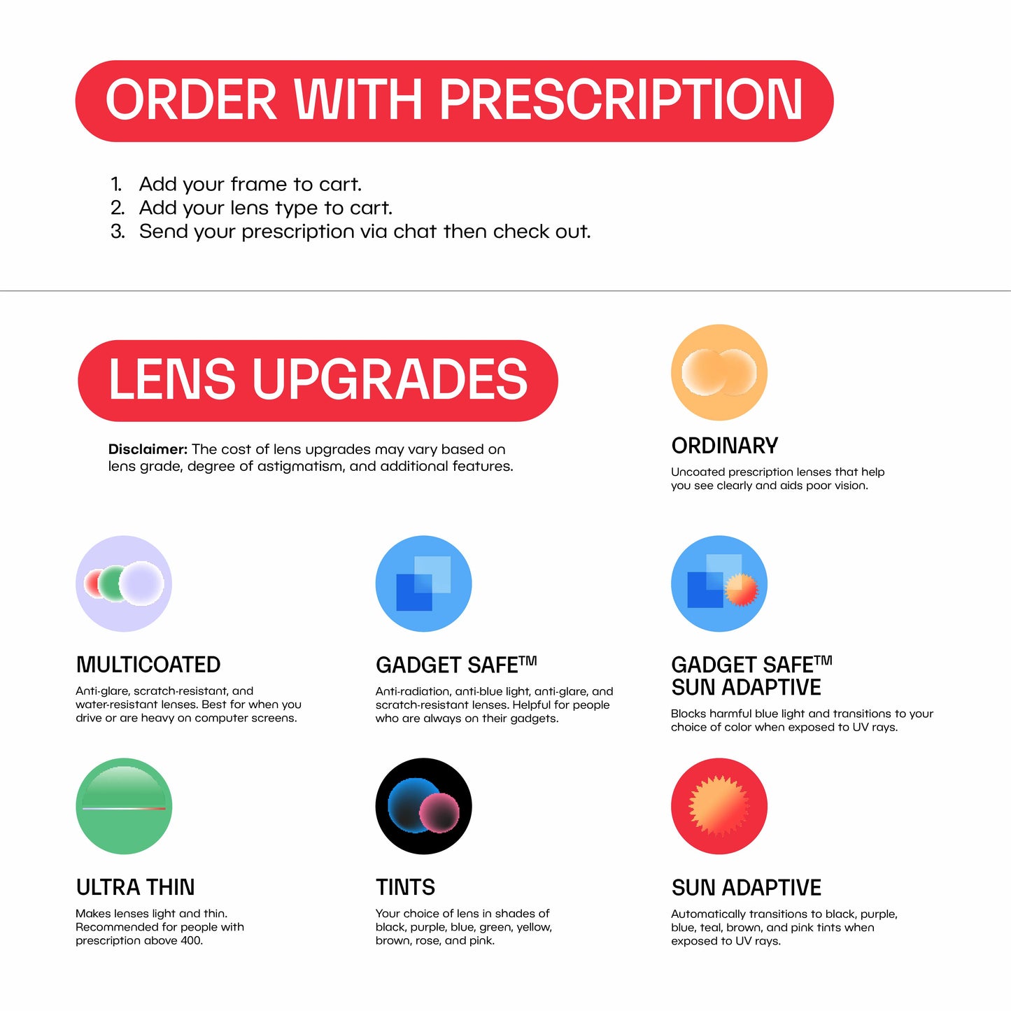 Did you know that you can upgrade your lenses and add prescription here on Baobab? Make sure to select your preferred upgrade and send us your prescription, if any, before clicking the Add to Cart button.